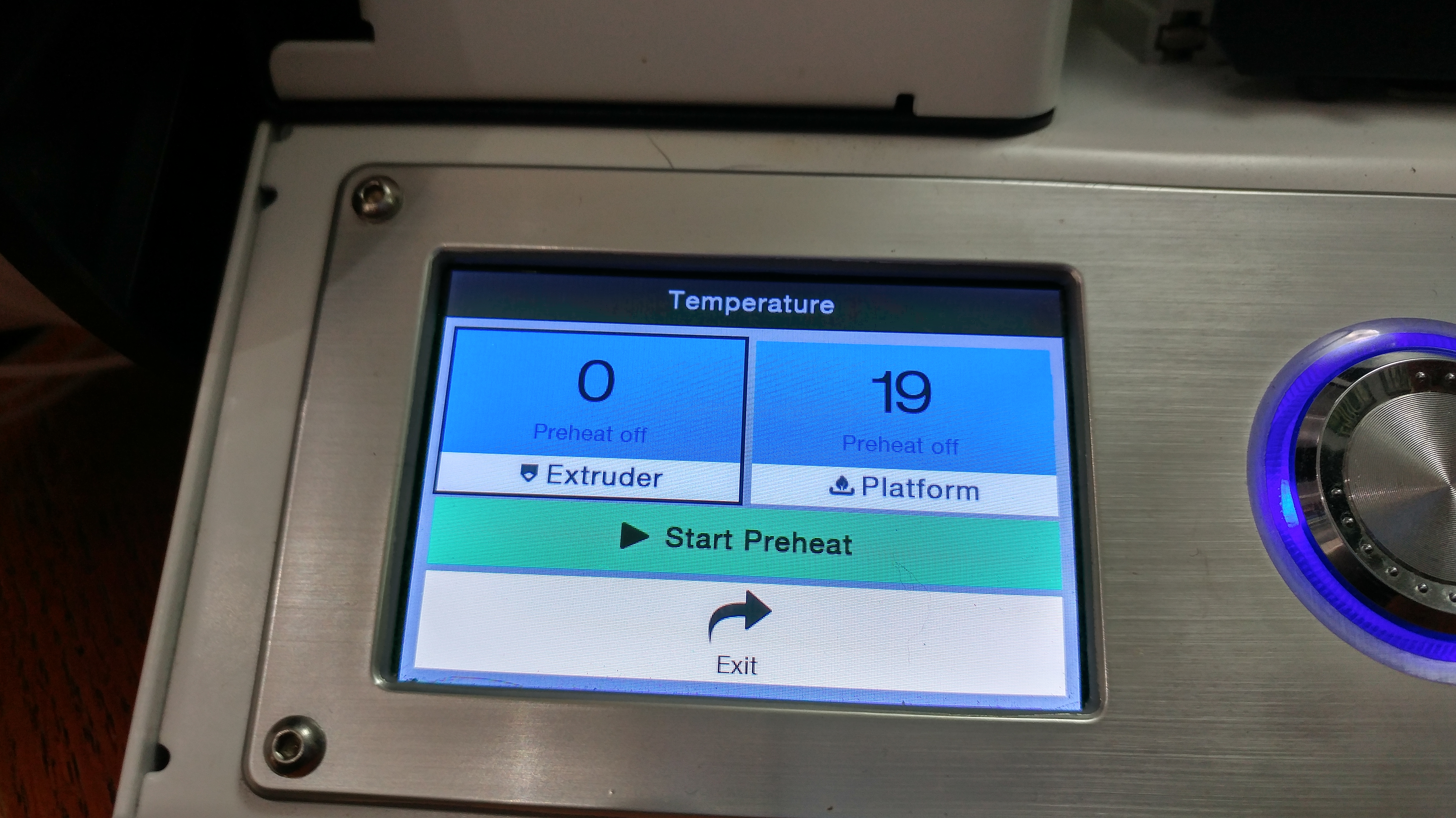 Before we updated the firmware, the printer got into a strange state and ran itself to the extremes of the X and Y axes and then tried to go further. When that happened, something happened and the extruder temperature started showing as 0.