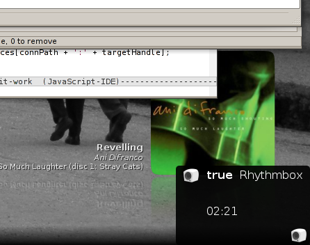 This first week of official coding, I started by playing with ways of implementing more useful/newer versions of what we know as status icons. In later revisions of the shell, only system-specific icons will get to keep their coveted places at the top of the screen, and the rest of the programs that try and use passive notification will be banished to the lower right hand corner, where I get to try and make them better.Here you can see the fruits of three hours of banging my head against gjs's dbus interface. This may or may not bear any resemblance to how the tray icons will eventually look. This week was spent trying to figure out the best way to deal with status icons. We want to integrate the notifications and more functionality - like in-tray IM for telepathy - into the system and so it's difficult to decide whether to try and add more information to the libnotify popups or to implement lots of app-specific sources.